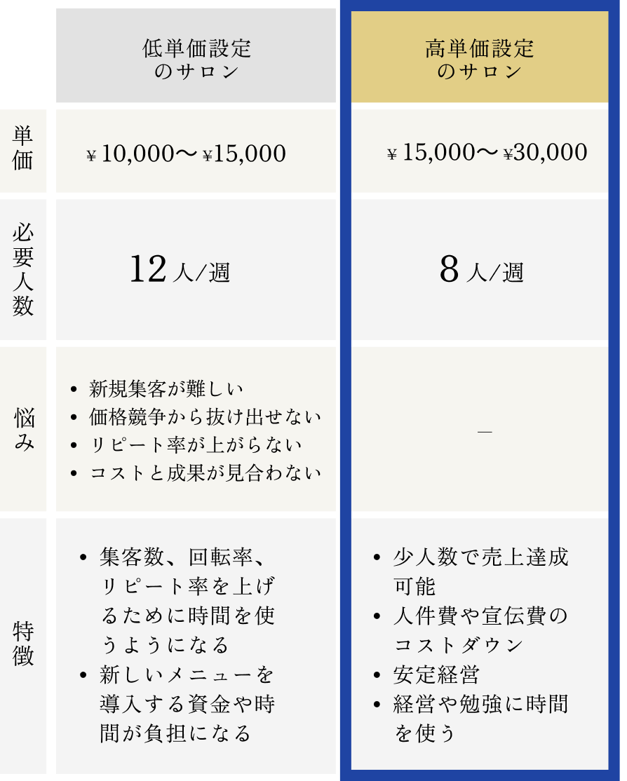 低単価設定のサロン 高単価設定のサロン メニュー単価 ¥10,000~¥15,000 ¥15,000~¥30,000 必要人数 12人/週 8人/週 悩み - 価格競争から抜け出せない